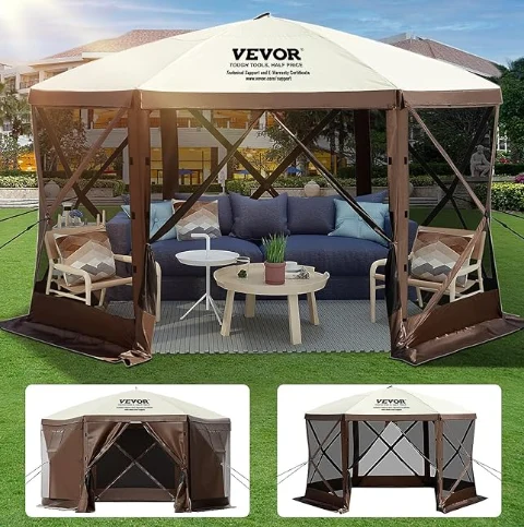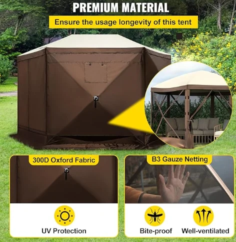 I-rainifproof ye-gegoof ye-canopy ye-canopy ye-canopy, i-gazeping ye-gazebo ye-GAZEO yenziwa nge-300D Axford Ilaphu kunye ne-B3 Gauze News. Yi-IPX3 YAMANZI, UBUCHULE BOKUGQIBELA, kunye ne-UV-vides. I-12 'ye-12' x 12 'i-gezenolo inika indawo enkulu yokufumana indawo yokufihla.