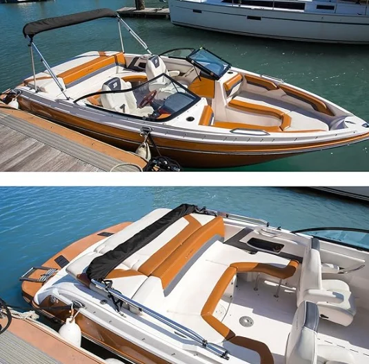 Inqanawa engenanto i-Bimini ephezulu, yenziwe nge-Marine yeBanga le-600d Pontuster ye-Pontuster ene-Puestas, i-boot yethu yokugcina ibonelela ngokhuseleko oluhle lokukhanya kwelanga, amanzi olwandle, imvula nothuli.