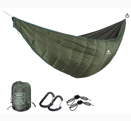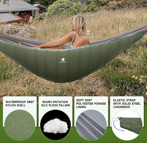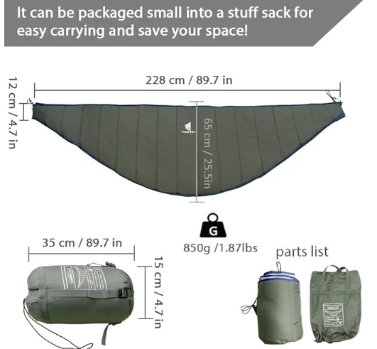 Amaxesha ama-3 ukuya kwi-4 ye-sumons hammock quilt ilungele amaqondo obushushu avela kwi-41 ° F ukuya kwi-68 ° F; Ibulele ngokugqibeleleyo ukuze ilingane ne-hammock, ayikhuseli kumoya kwaye ikugcine unyanzelwe ngokufudumeleyo.